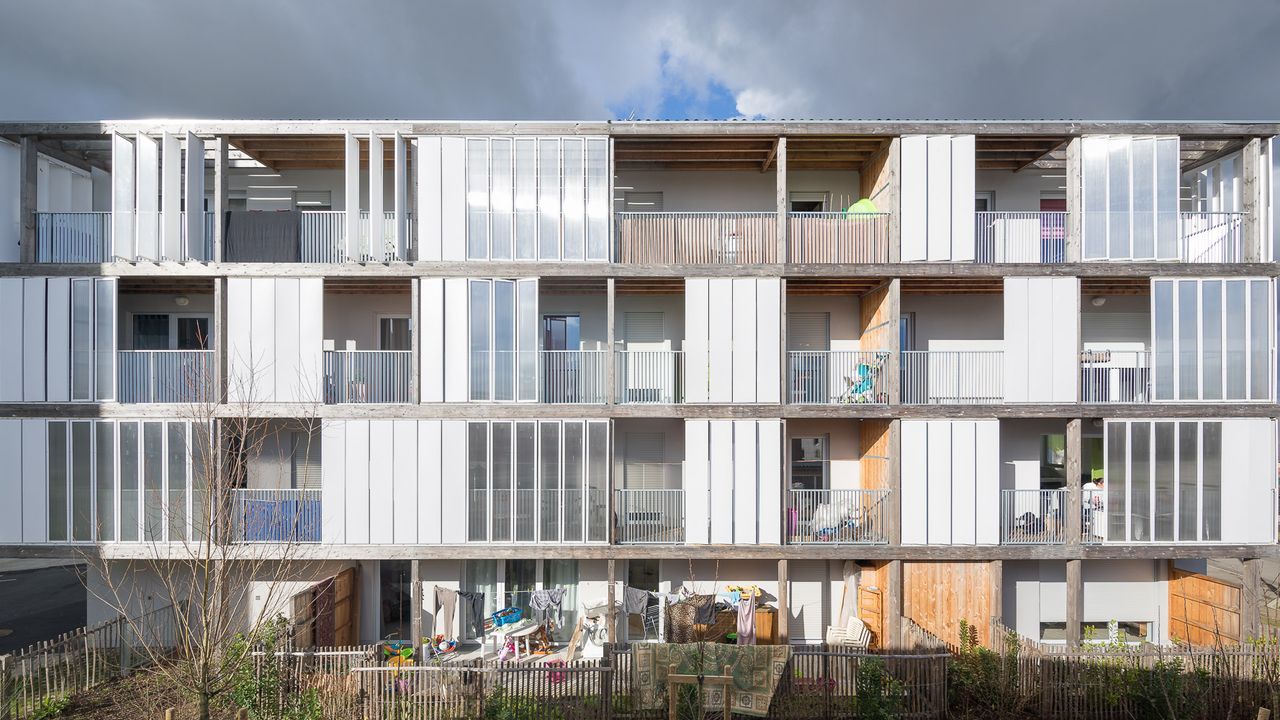 Les volumétries simples, efficaces sont dédoublées dans leur épaisseur par des structures bois auto-portantes: coursives de distribution au nord avec celliers dans les étages, et balcons loggias privatifs au sud. Ces éléments légers tendent à affirmer leur présence, afin d'offrir une épaisseur construite, appropriable. Au sud, des lames pivotantes toute hauteur permettent aux habitants de moduler l'ensoleillement et de maintenir une certaine intimité dans leurs logements, en masquant les vues depuis la tour.