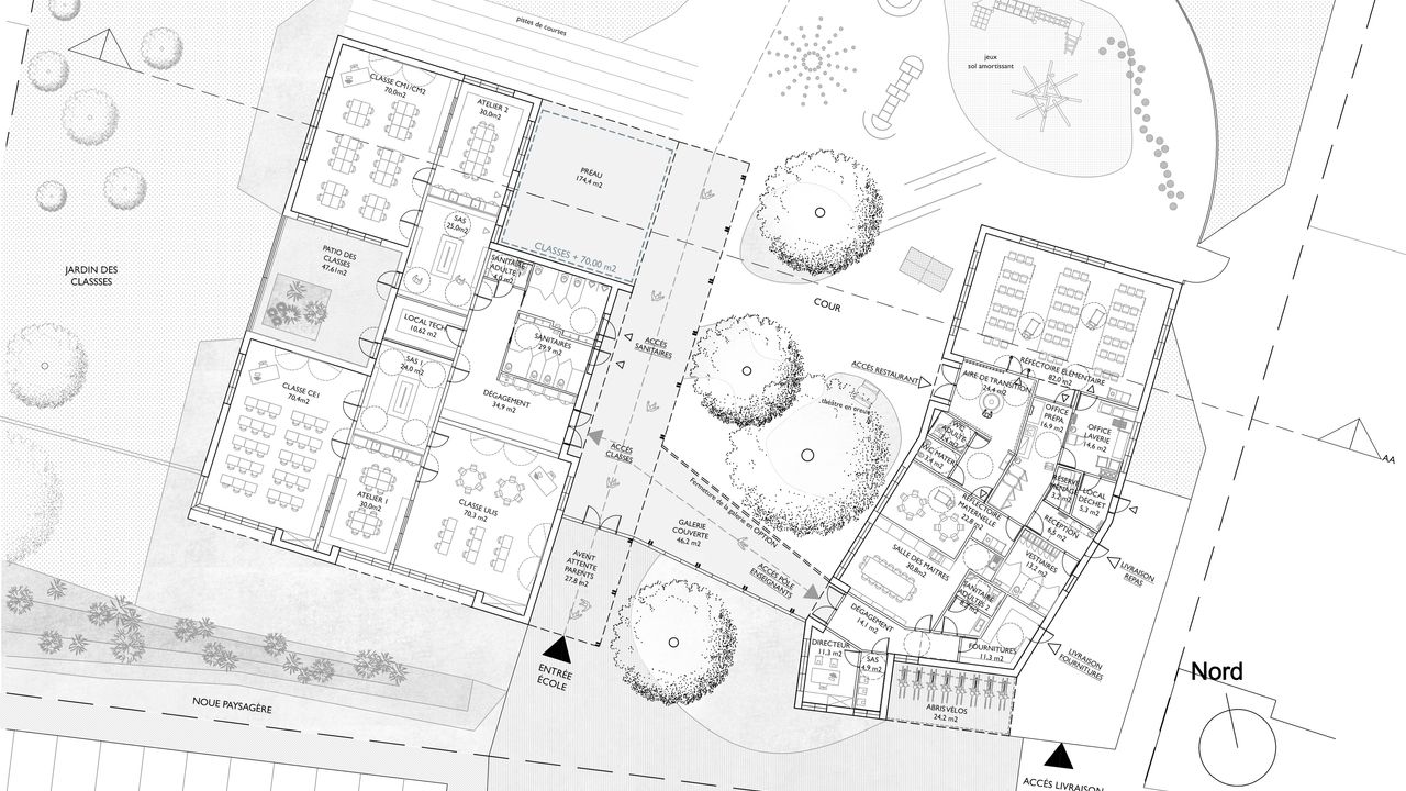 Le projet s'adosse donc en limite sud, pour affirmer une visibilité publique de l'ensemble du groupe scolaire, dans un jeu de pignons successifs prolongés par des bâtiments qui s'étirent dans la transversalité du site. Les arbres existants conservés accompagnent les parcours et caractérisent l'ambiance paysagère des espaces extérieurs (cours de récréation).