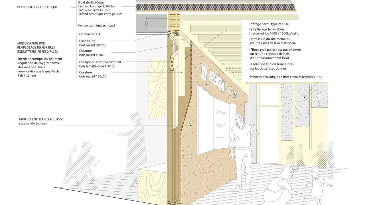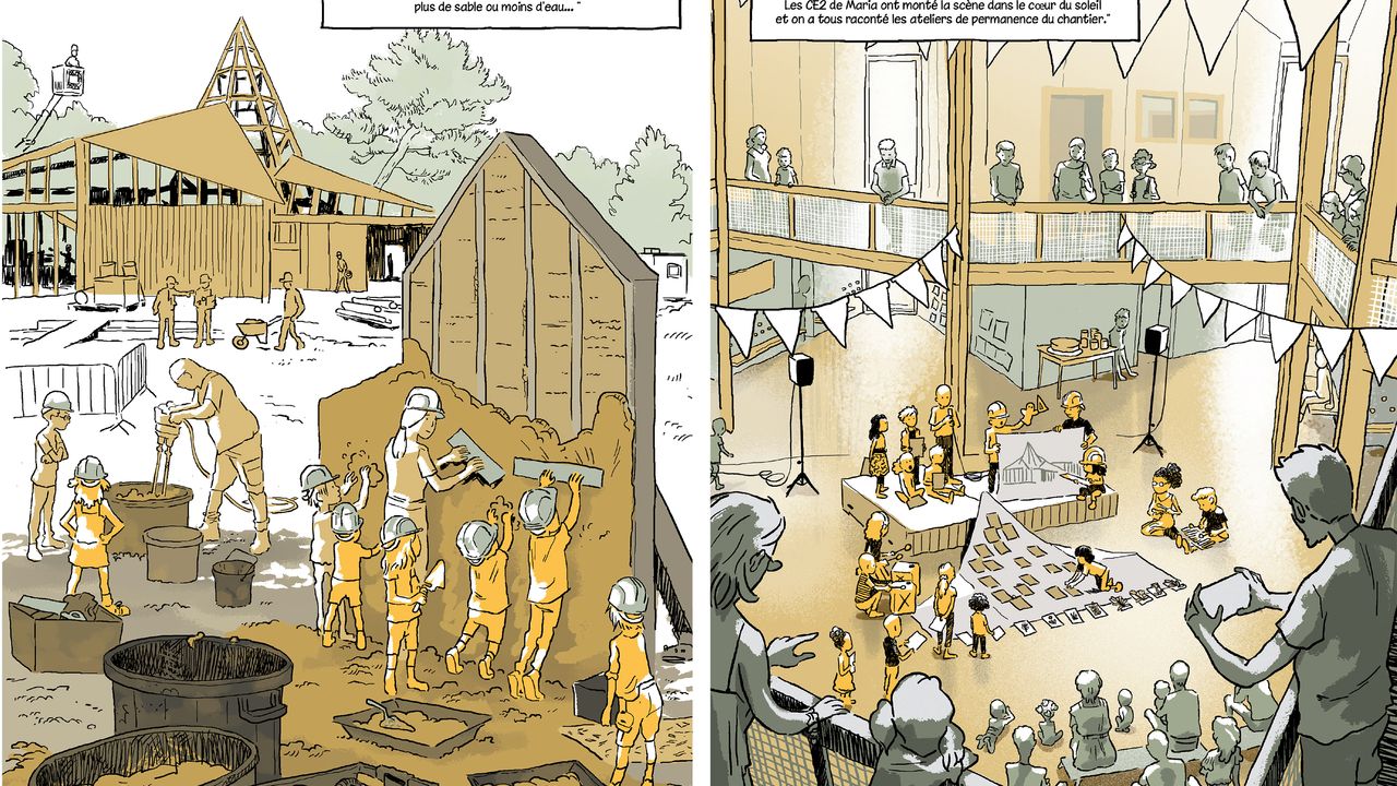 Le chantier poursuivra cette approche originale en prolongeant sur le terrain le processus d'implication et d'expérimentation. Comme l'école, l'architecture est une fête : elle exerce la curiosité, elle raconte le rapport entre les choses et leur environnement, elle ouvre des chemins, elle résonne.