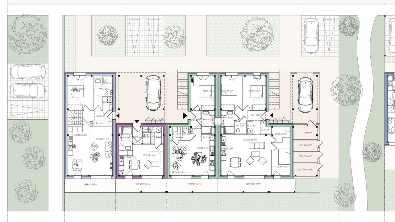 La variété des assemblages des différents types, accolés, en miroir ou superposés, et le travail de différentes césures urbaines et bâties permettront d'offrir sur chaque site la perception d'un projet unique, adapté au contexte.