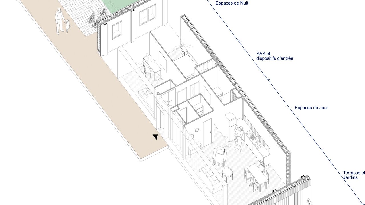 Enfin, le traitement du jardin : composé d'une extension du bâti formant protection solaire, terrasse ou balcon, et d'un espace planté de pleine terre, clôturé de haies plantées doublées d'une clôture bois de 1,80 m en mitoyenneté. Trame constructive efficiente : une trame constructive unique, issue d'une rationalité constructive adaptée au contexte de sismicité modéré, permet de libérer le plan des logements de tout élément porteur. Le projet propose une combinaison d'assemblage de logements modulaires via la conception d'une trame de 6 m de large par 13 m de long, orientée en nord/sud, adossant les logements par leur long pan. Ainsi, chaque typologie prend place dans ce maillage de poteaux et de poutres porteurs, structurellement pertinent pour une construction à ossature bois. L'accolement par le long pan permet une bonne compacité dans les assemblages, en réduisant la taille des façades déperditives, qui sont les petits pans. De même, les volumétries sont efficaces, les double pans des toitures formant des murs pignons mitoyens. Les toitures s'abaissent naturellement du côté des façades vitrées, permettant des protections solaires par les débords. (pergolas et balcons sur tous les types).