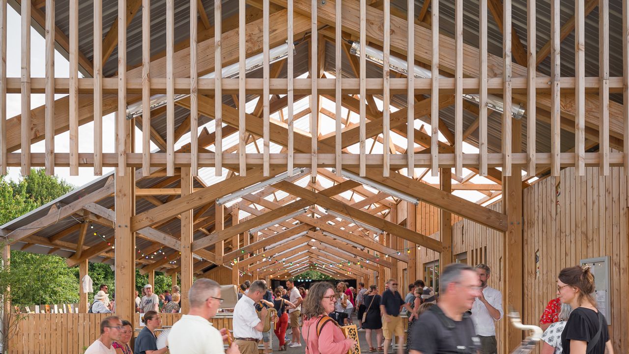 Deux nefs regroupent sous un même toit l'ensemble des trois entités programmatiques, de manière relativement compacte, afin de libérer un grand espace libre, un grand couvert capable d'accueillir les usages courants, à couvert protégé, des temps périscolaires. Cette capacité étend l'équipement au reste de la commune sur des usages publics et associatifs, offrant une grande halle pour les événements du bourg (brocante, marché, assos...). Ce lieu actif, entre intérieur et extérieur, caractérise fortement l'ambiance de l'équipement sur la place publique centrale.